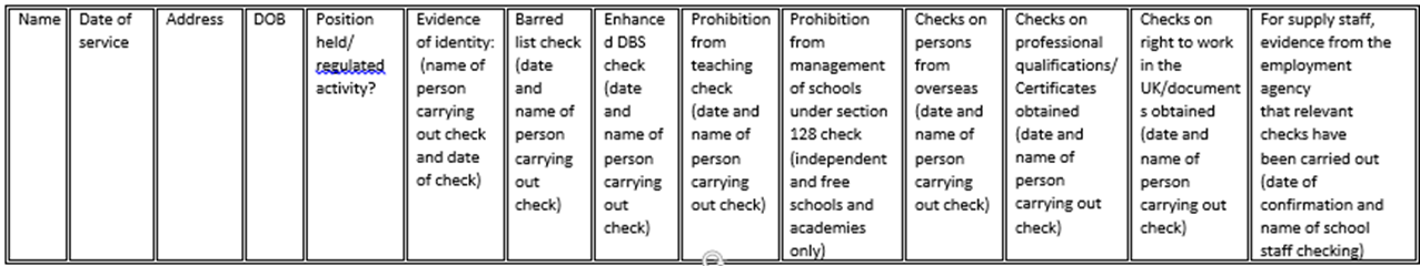- The Single Central Records should include details of all checks carried out and the outcome of these checks or any certificates obtained in the format shown at Appendix 1.